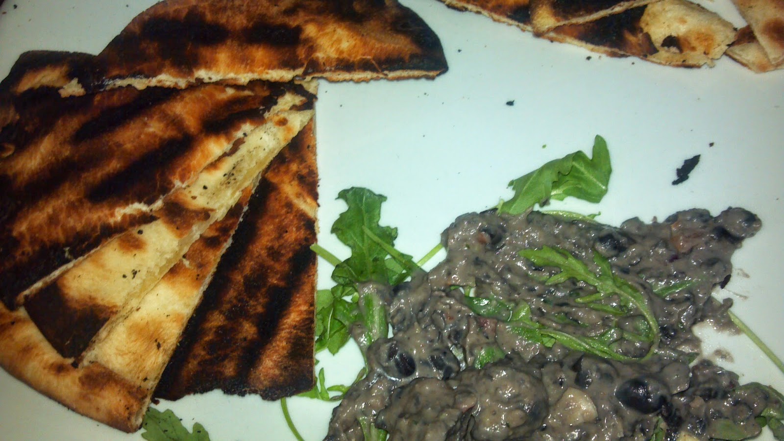 Our other starter was the Oscar Della Hummas black bean hummus and charred pita. It was beautifully savory with a perfect texture. It also had arrugula tangled up in it, I supposed to make it extra challenging to get it onto the pita, but it's hard to tell why.