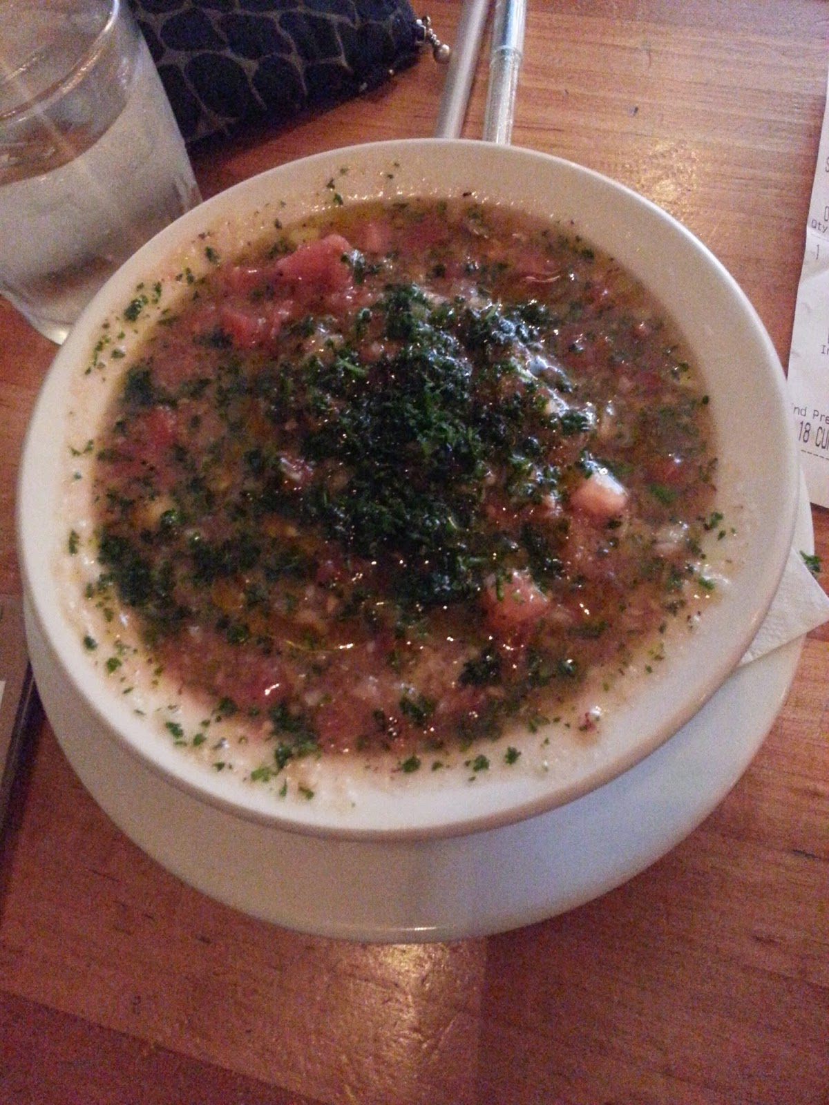 Under that garnish of a mound of parsley was a fabulous and wonderful gazpacho! It was a wild ride of tomato, olive oil, garlic, vinegar and heat with cucumber and onion underneath. Although the cucumbers were in the form of puree, the other ingredients were chopped, so that the texture had a gentle bite and was not merely all liquid. I was not only thanked for ordering but got to talk about the joys of gazpacho with the composer of this outrageous bowl of summer. I want to go back when he has ripe summer tomatoes to work with.