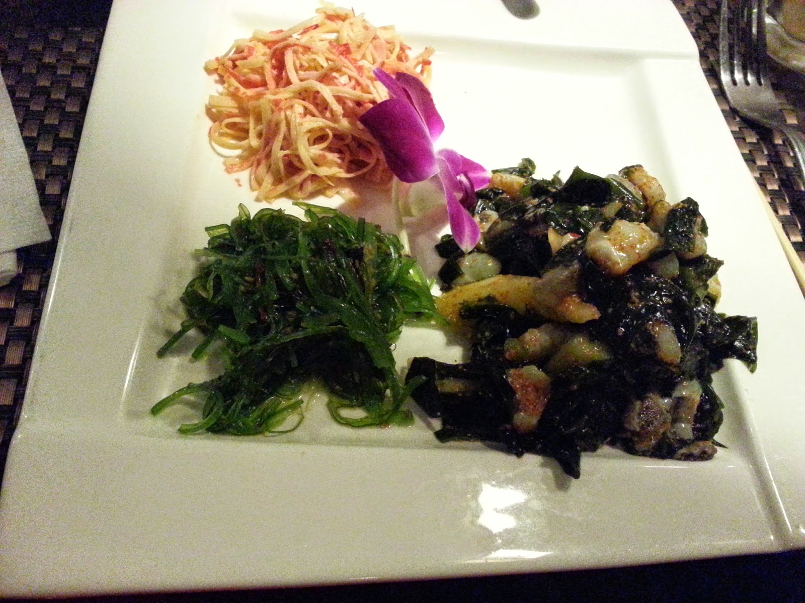 Crab, seaweed and octopus salads - wakame with the octopus and a delightful salad.